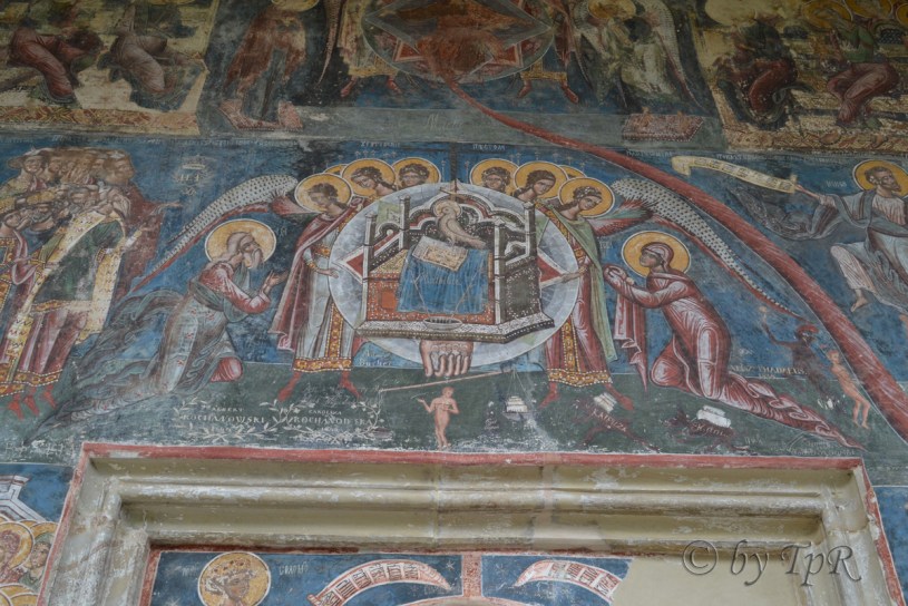 Tall arches open the porch to the outside and daylight. Within it, „The Last Judgment” covers the entire surface of the west wall with its river of fire and its depiction of the sea giving up its dead to judgment. Moldovita and Humor are the last churches built with an open porch, a hidden place above the burial-vault, and with Gothic-style windows and doors.