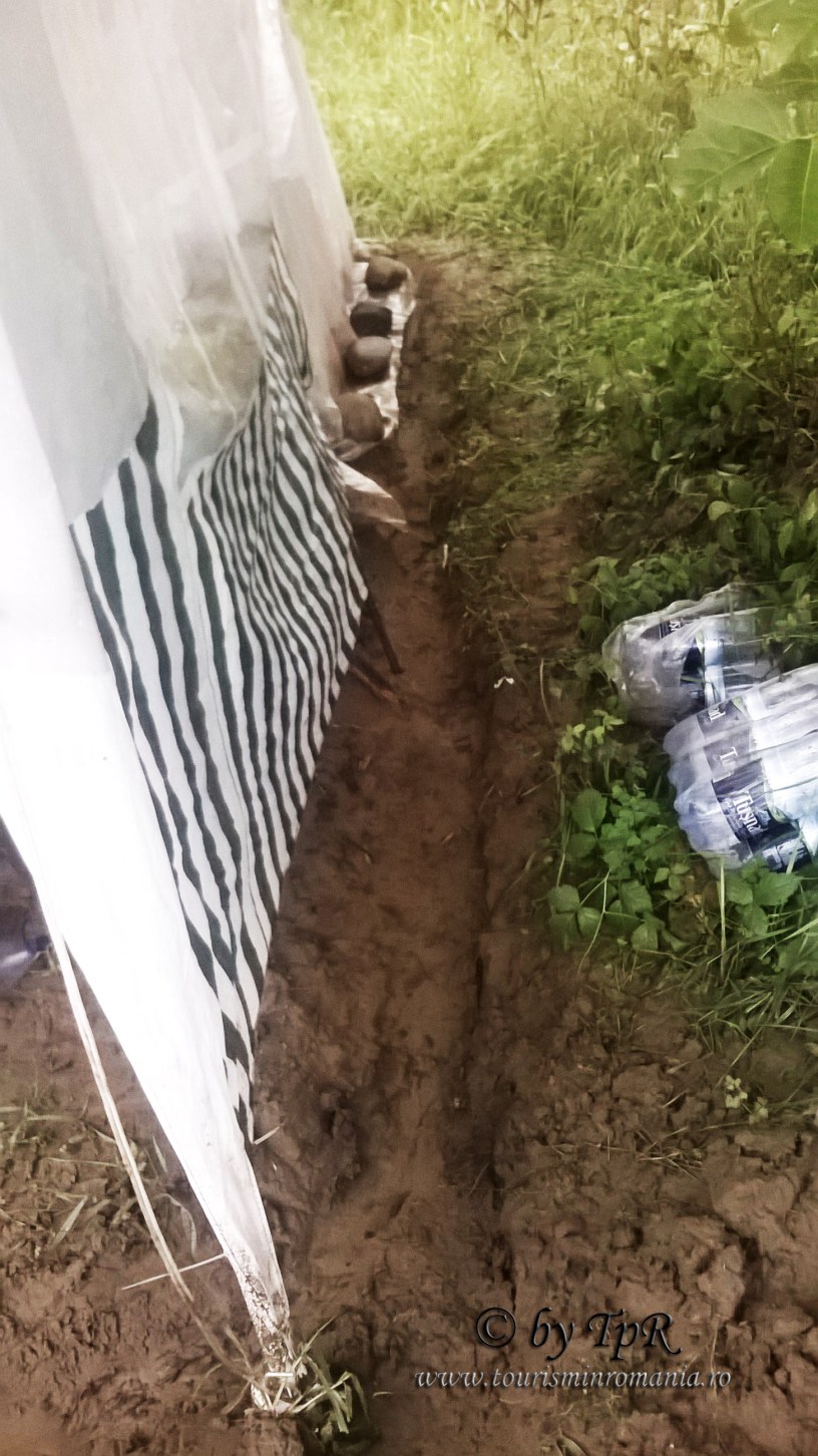 - Alegeți o colină plată, mai înaltă decât restul zonei neinundabile pentru a scăpa de neajunsurile unei ploi torențiale. Săpați un șanț în jurul cortului de cel puțin 15 cm adâncime care să asigure drenajul apei în caz de ploaie. Scurgerea va trebui să fie spre cea mai joasă zonă din vale, astfel încât să nu se creeze vreo baltă prin vecinătatea cortului.