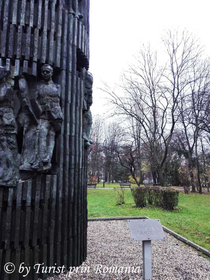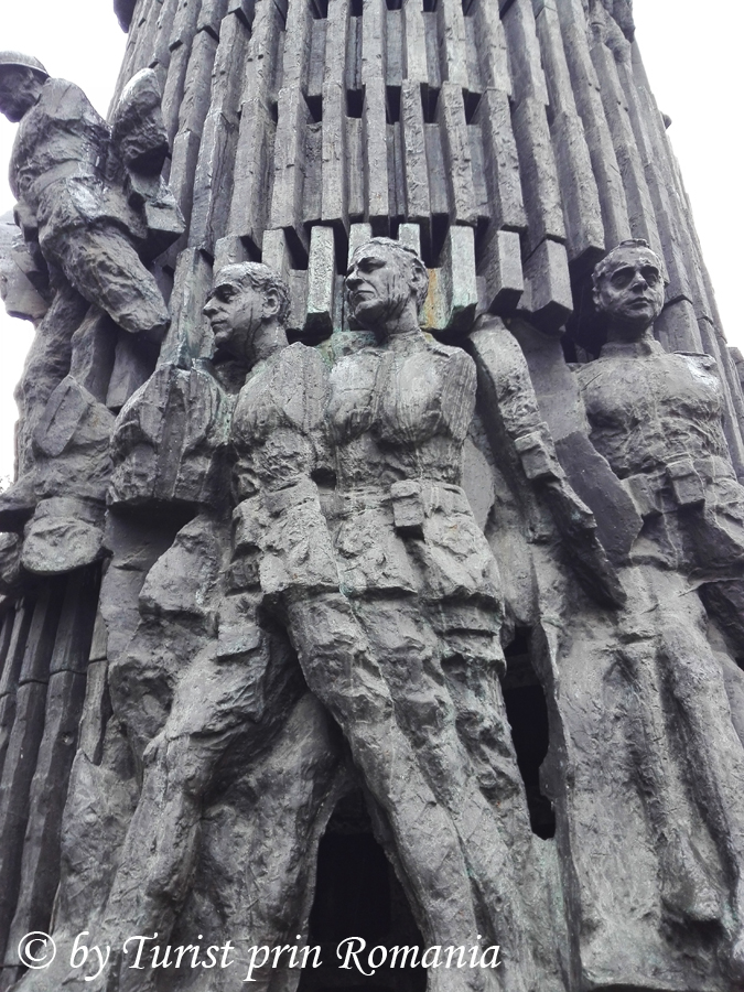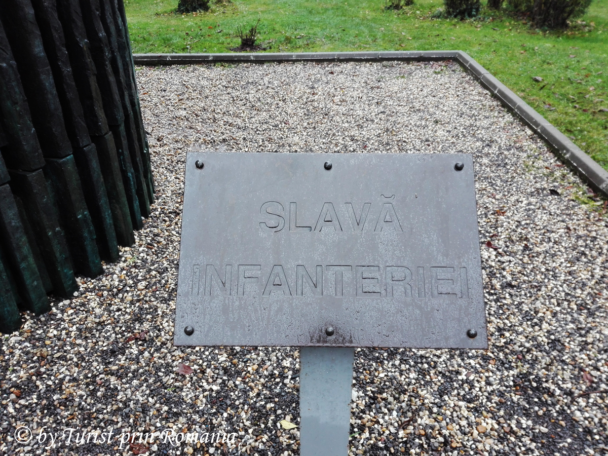 Eroii Primului Război Mondial și Celui De-al Doilea Război Mondial se înalță către cer sprijinindu-și trupurile frânte de coloană. Către înaltul cerului parese că însăși coloana se destramă, într-un amalgam de fier și trupuri frânte, ca o ofrandă adusă lui Dumnezeu. Este emoționant. Este devastator, considerând numărul infanteriștilor români care au murit pentru țară. Acesta este și rostul existenței acestui monument: amintirea sacrificiilor infanteriei, a românilor de ieri pentru românii de astăzi.