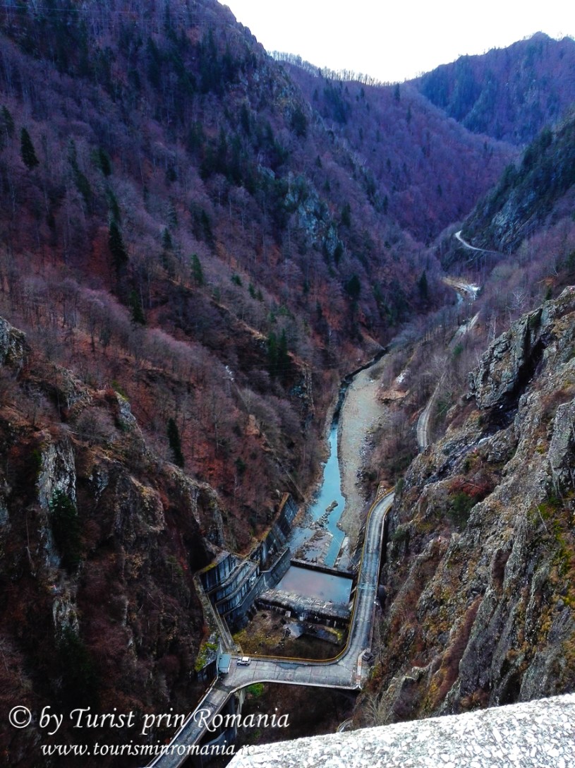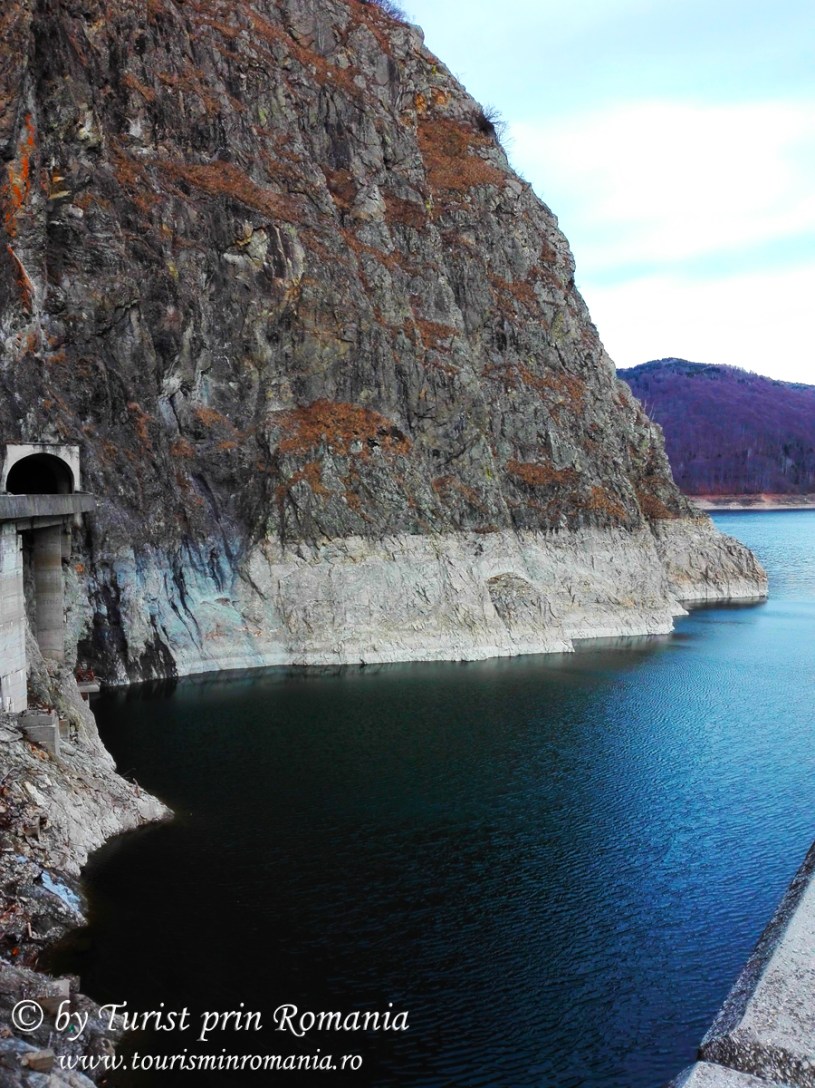 Puteam ocoli subiectul Lacul Vidraru, aflat în lista noastră de obiective de văzut în excursia noastră de o zi? Categoric, nu. Era o zi cenușie, soarele fiind zgărcit cu aparițiile sale. Doar aunci când am urcat cele 1480 de trepte până la Cetatea Poenari, soarele a zâmbit puțin, printre nori, dar fără mult chef. Când am ajuns la baraj, un vânt aprig ne amintea că suntem încă în plină iarnă, chiar dacă nu era zăpadă. Aerul era curat și se vedea până departe. Culorile triste ale iernii fără zăpadă contrastau cu luciul apei Lacului Vidraru care oglindeau albastrul intens al cerului.