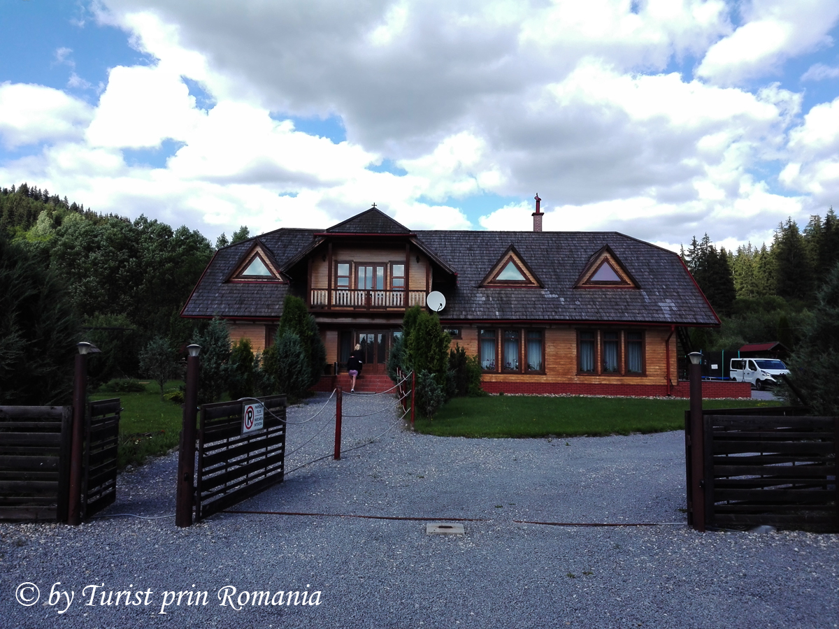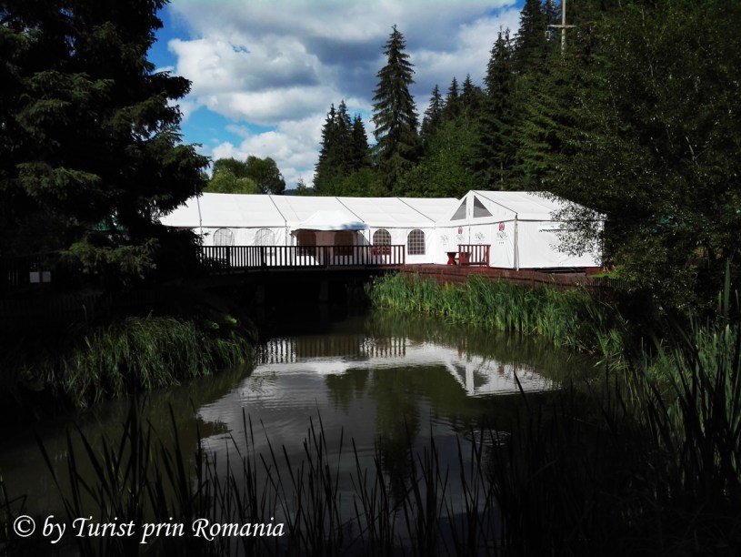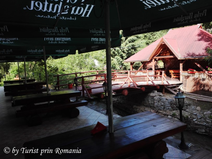 Puțin mai departe se întrezărește o păstrăvărie ale cărei ape intră sub terasa acoperită cu podea de sticlă.