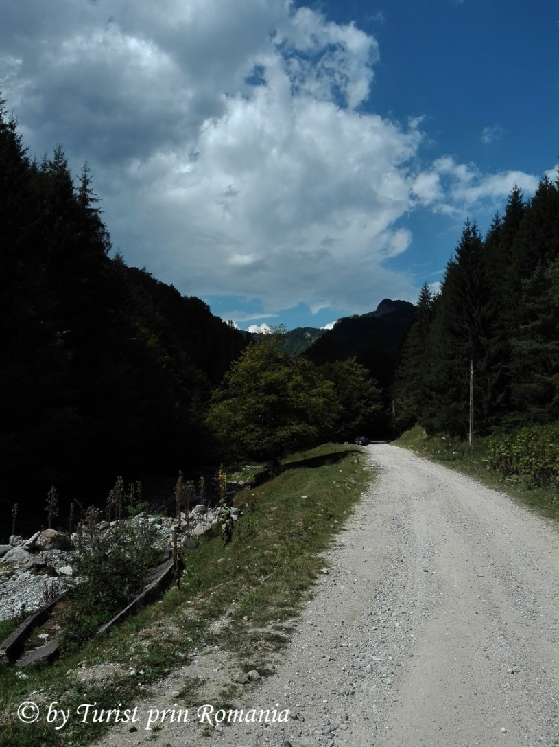 Lăsăm vagabondul (mașina) pe marginea drumului, trecem peste o apă rapidă de munte, aflată pe partea stângă și urmărim crucea albă. Începem să urcăm pieptiș, prin pădure. Slavă Domnului că nu a plouat de curând. Cărarea prin pădure, cu pante abrupte, plină de frunze și praf, ar fi devenit aproape imposibil de urcat.