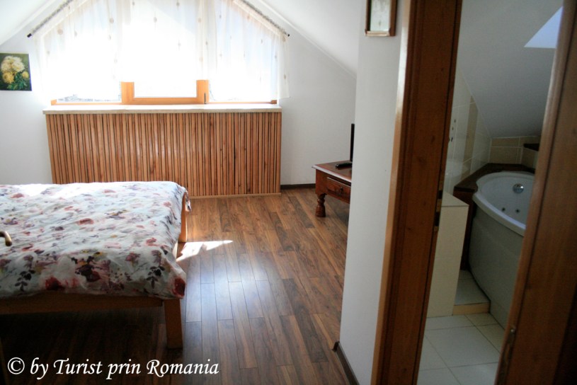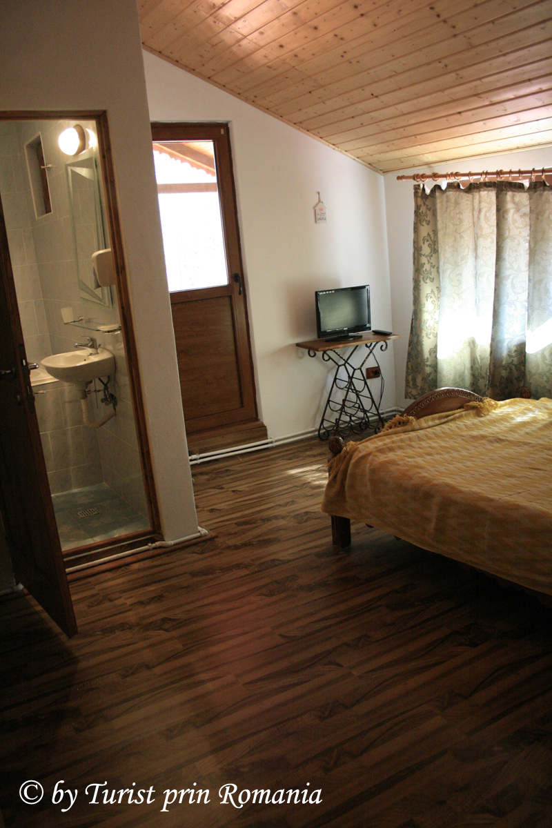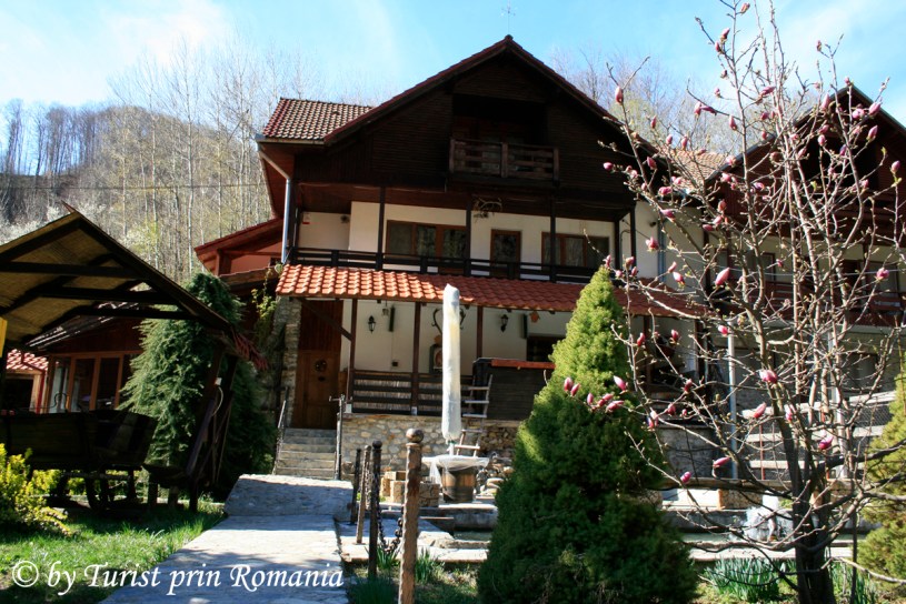 După câteva serpentine largi ajung la un pâlc de case pe partea dreaptă. Continui drumul și pe partea stângă văd un gard din lemn și o cabană ce se ridică mândră printre steiurile de piatră. Priveliștea este cel puțin interesantă pentru că, inițial nu prea îți dai seama cum s-a putut construi în piatră, dar odată ce intri pe poartă îți dai seama că așezarea terenului și configurația reliefului a lucrat în concordanță cu priceperea constructorului.