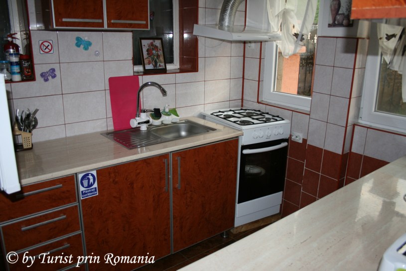 Pe partea stângă, chiar la intrare, o bucătărie utilată cu toate cele necesare pentru petrecerea unei perioade lungi aici, mă refer la frigider, veselă, filtru de cafea, toaster, aragaz cu cuptor, cuptor cu microunde și multe altele necesare pregătirii unei mese. Am fost foarte plăcut surprins să constat că pe bufet exista un bol cu bomboane din care am fost invitat să servesc, din partea casei, un pic de dulce.