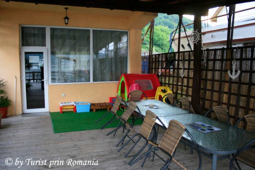Sala de mese poate primi cu ușurință 30 de persoane, foarte curată și bine organizată. Din sala de mese se poate ieși pe terasă unde peisajul este absolut mirific. Terasa este decorată cu obiecte specifice zonei, parâme de nave, timone, elici de barcă și alte obiecte pescărești. Imediat după terasa acoperită urmează un ponton cu câteva șezlonguri pentru plajă și debarcaderul de unde se poate pleca în excursii la Cazanele Dunării, Tabula traiana, Chipul lui Decebal sau cele două peșteri Grota Veterani și peștera Ponicova sau Mănăstirea Mracuna.