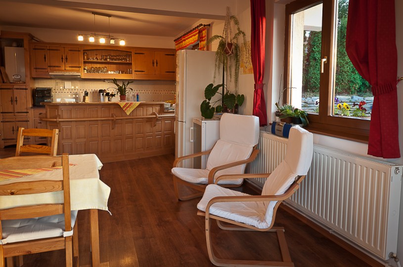 Bucătăria modernă a Pensiunii Horizont este dotată cu tot ce este necesar pentru pregătirea mesei (cuptor cu microunde, maşină de spălat vase, aragaz).