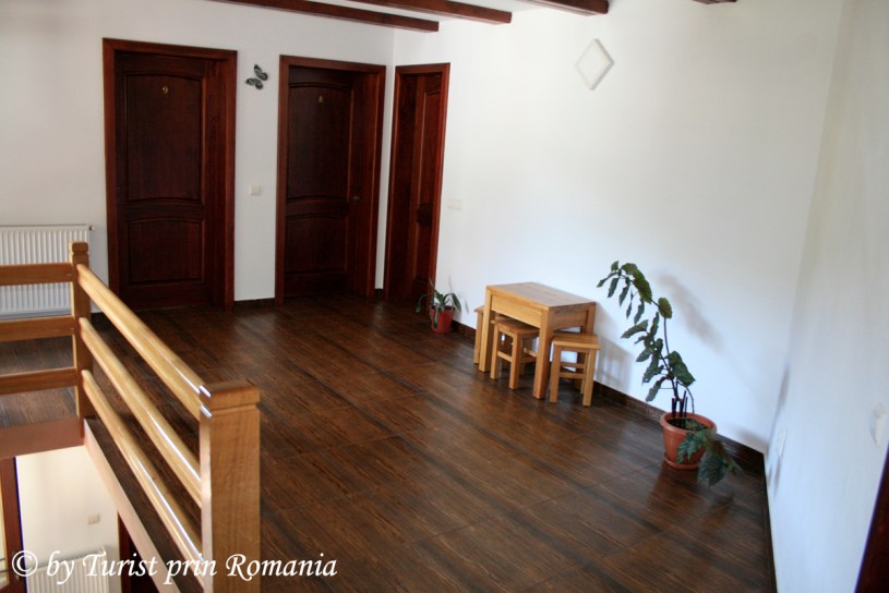 Am urcat pe scară, la primul etaj. Un hol spațios din care se putea intra în camere. Toate camerele Pensiunii Georgiana și Gabriel au ieșire către balcon și au baie proprie.