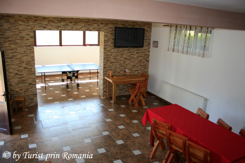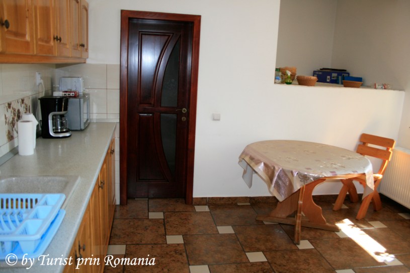În partea dreaptă, o bucătărie complet utilată completa peisajul sălii pentru servit masa. Opus, dar lângă intrare, un spațiu special amenajat pentru tenis de masă. Am aruncat un ochi în bucătăria Pensiunii Georgiana și Gabriel și am rămas foarte plăcut impresionat de ordinea și curățenia de aici.