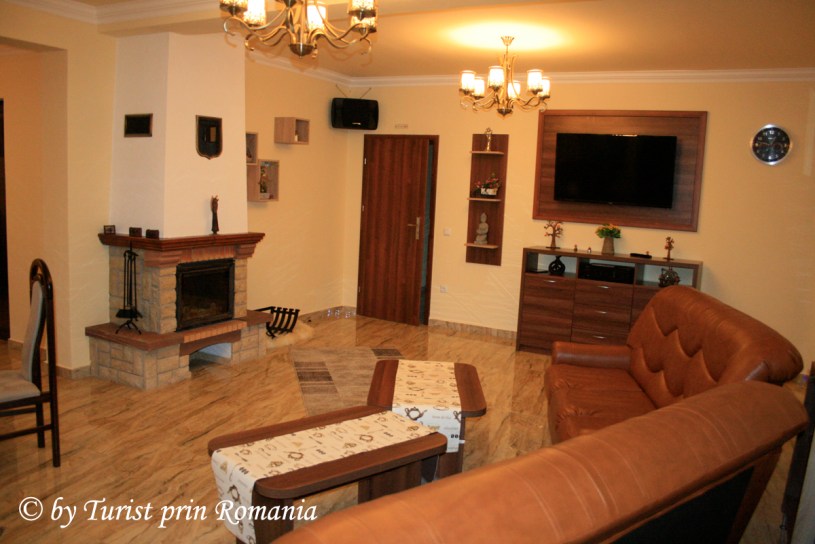 Am intrat într-un hol scurt, apoi într-un spațiu imens împărțit într-o zonă de relaxare în partea dreaptă unde un șemineu imens îți făcea cu ochiul și un salon pentru servit masa în partea stângă. Imediat a apărut și administratorul Pensiunii Popasul Montan, domnul Nicu Ionescu.