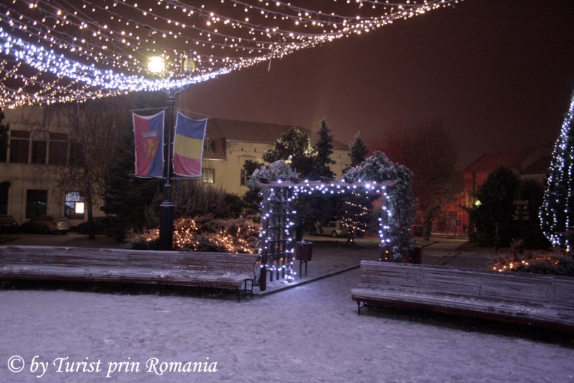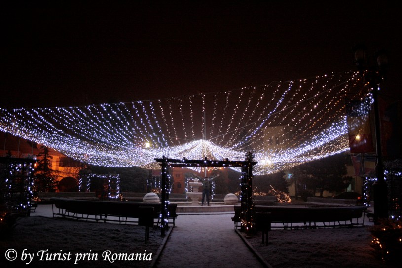 Vitrinele magazinelor erau pregătite de sărbătorile de iarnă și geamurile frumos ornamentate cu decoruri de iarnă adăposteau Moși Crăciuni și obiecte specifice Crăciunului. Fulgii de nea cădeau ușor în lumina felinarelor și completau peisajul de basm al Sebeșului. Străzile frumos îngrijite primeau cu căldură pașii ce mi se îndreptau ușor către parc. M-am oprit și am făcut câteva cadre.