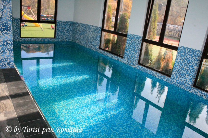 Piscina, cu mozaic albastru, foarte curată și bine întreținută, te îmbie la o baie caldă, de relaxare după o masă copioasă sau la o partidă de înot pentru a face poftă de mâncare.