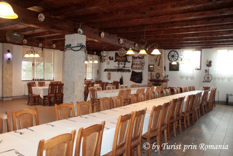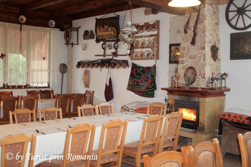 Din această sală, am intrat în restaurantul propriu zis, o cameră cu 40 de locuri frumos decorată cu elemente tradiționale. Am continuat cu explorarea și am ajuns într-o sală de evenimente cu 120 de locuri unde, un șemineu imens răspândea o căldură plăcută.