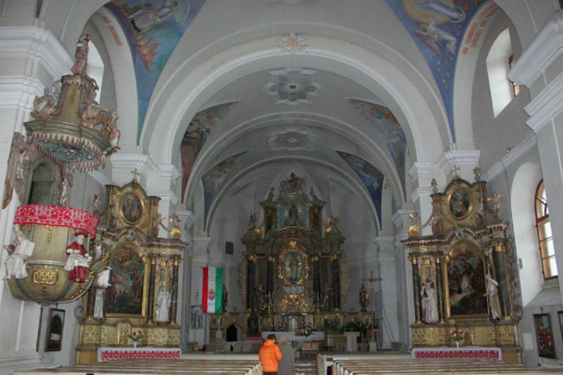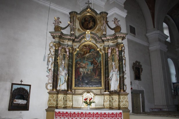 Tabloul central reprezintă Botezul lui Hristos, care, cu un picior în apa râului Iordan, se apleacă în faţa Sfântului Ioan Botezătorul, ca acesta să poată revărsa apa botezului peste capul său. Tabloul altarului lateral sudic este o reprezentare a Sfântului Ioan de Nepomuk. Sfântul stă îngenunchiat deasupra norilor, având în mână o cruce şi o ramură de palmier care indică martiriul său.