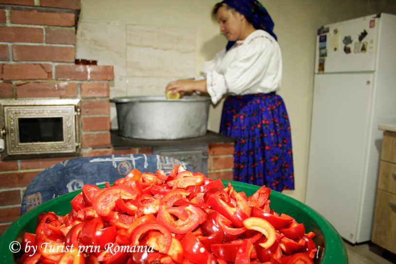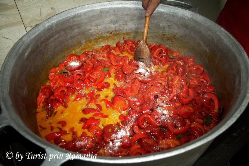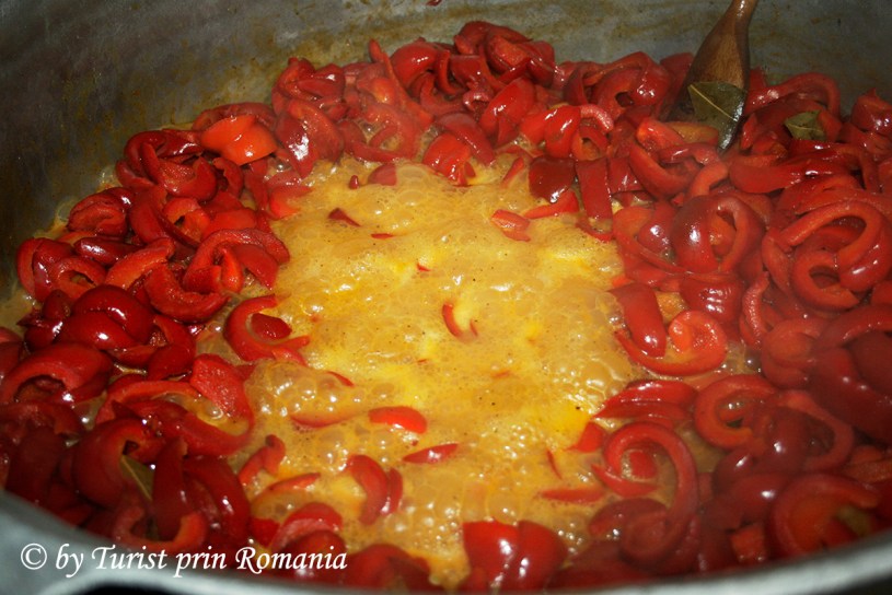 Deci, se spală bine gogoșarii și se curăță de cotor și semințe, apoi se taie felii de circa 1 – 1,5 cm lățime. Într-un recipient mare (în funcție de cantitatea pe care vreți să o faceți), puneți ulei, oțet, sare, piper și muștar și puneți la foc, de preferință pe plită încălzită cu lemn pentru a da savoare preparatului.