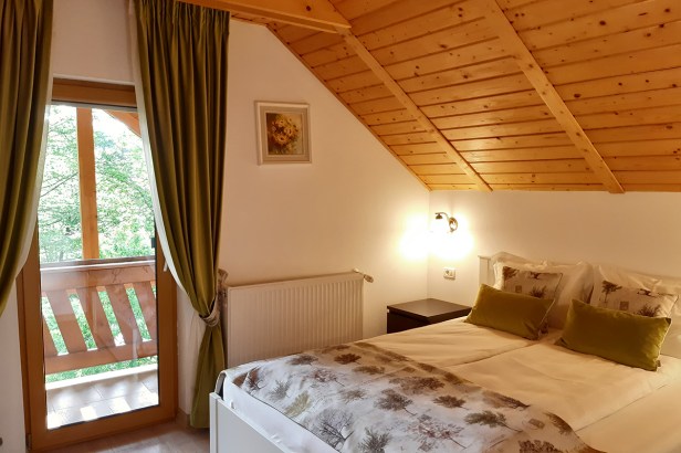Apartamentul 1, extra large, (6 persoane) este situat pe două nivele (mansardă și etaj) și dispune de 3 dormitoare, fiecare cu baie proprie, duș, living, bucătărie complet utilată, o baie de serviciu, terasă mare acoperită dotată cu mobilier de terasă, balcoane la dormitoare cu vedere către lac și munte.