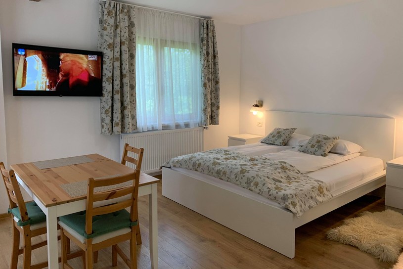 Apartamentul 1, extra large, (6 persoane) este situat pe două nivele (mansardă și etaj) și dispune de 3 dormitoare, fiecare cu baie proprie, duș, living, bucătărie complet utilată, o baie de serviciu, terasă mare acoperită dotată cu mobilier de terasă, balcoane la dormitoare cu vedere către lac și munte.