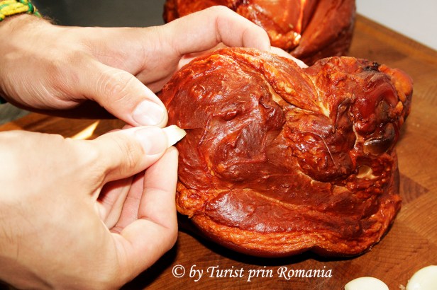 Dar, să o luăm cu începutul: se alege ciolanul, nu foarte afumat, și se împănează cu usturoi. De reținut este faptul că nu se pune sare deloc pentru că ciolanul are deja sarea necesară pentru a ieși un preparat savuros.