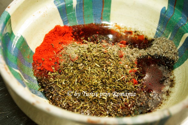 După ce Dani a împănat ciolanul bine cu usturoi, a pregătit un mix de condimente care a inclus boia dulce, tarhon, praf de usturoi, piper și alte mirodenii. Acest mix l-a amestecat bine cu o lingură-două de ulei, apoi l-a lăsat puțin la odihnit pentru a-și lăsa aroma.