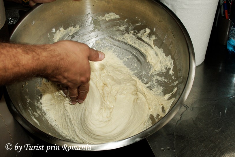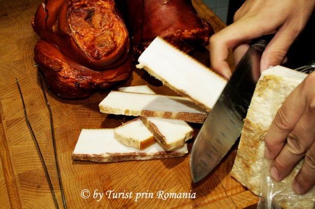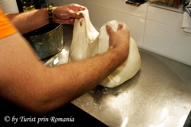 Aluatul obținut a fost întins pe o masă bine unsă cu ulei, apoi au fost tăiate câteva bucăți de slănină groase cam cât degetul mic și așezate în mijlocul foii.