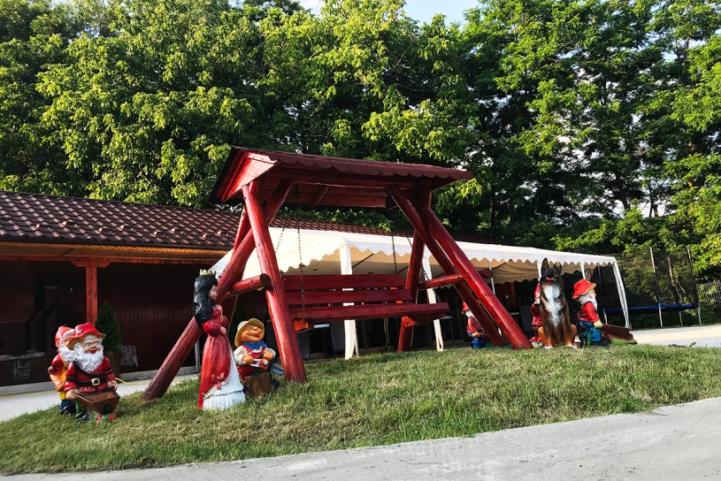 La exterior, o terasă încăpătoare cu accesorii din lemn masiv, un spațiu verde și locul de joacă pentru copii asigură siguranța și confortul familiilor venite aici cu cei mici.