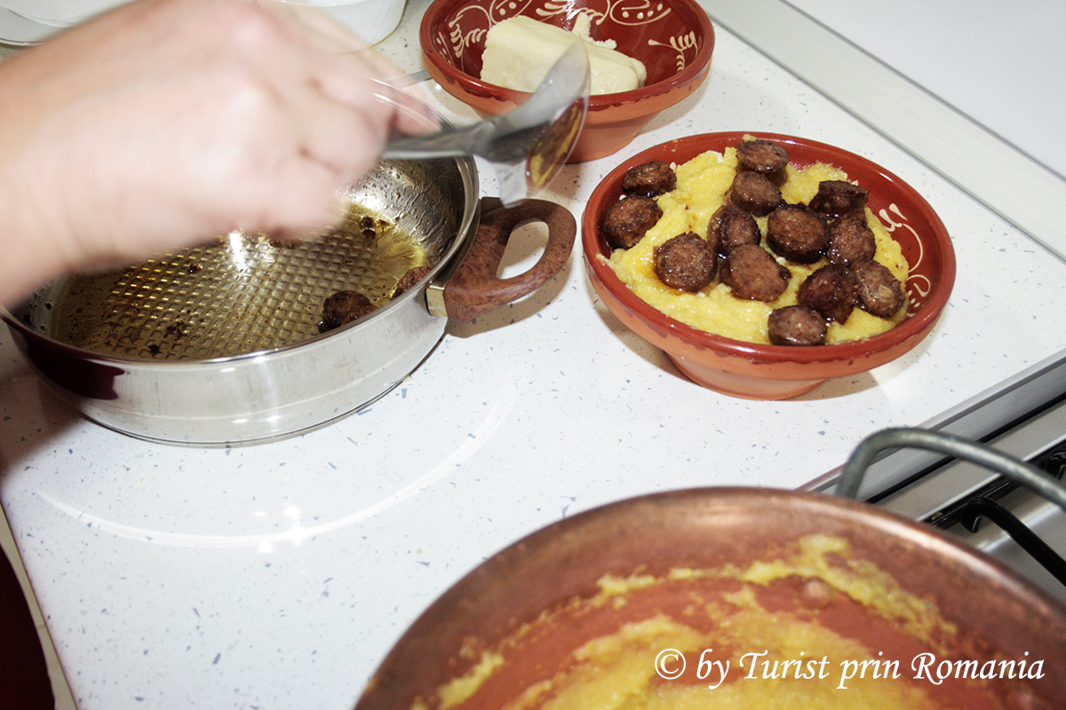 Precum spuneam, cârnații au fost scoși de la garniță și puși frumos cu puțină untură în tigaie la încălzit, apoi făina de mălai a fost pusă treptat în vasul de cupru în care deja apa se încălzise aproape de punctul de fierbere.