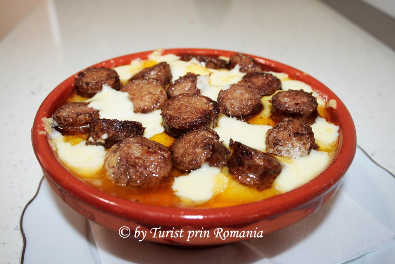 După acest proces, a venit rândul cârnaților care au fost tăiați rondele și rânduiți frumos peste ultimul strat de mămăligă. Puțină untură topită și câteva bucățele de brânză au constituit topingul preparatului.