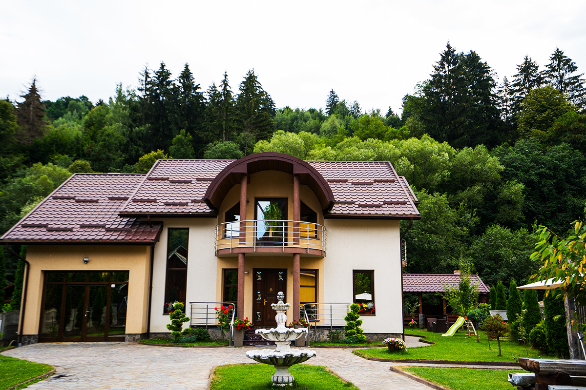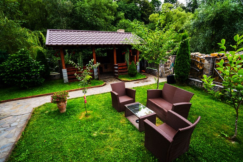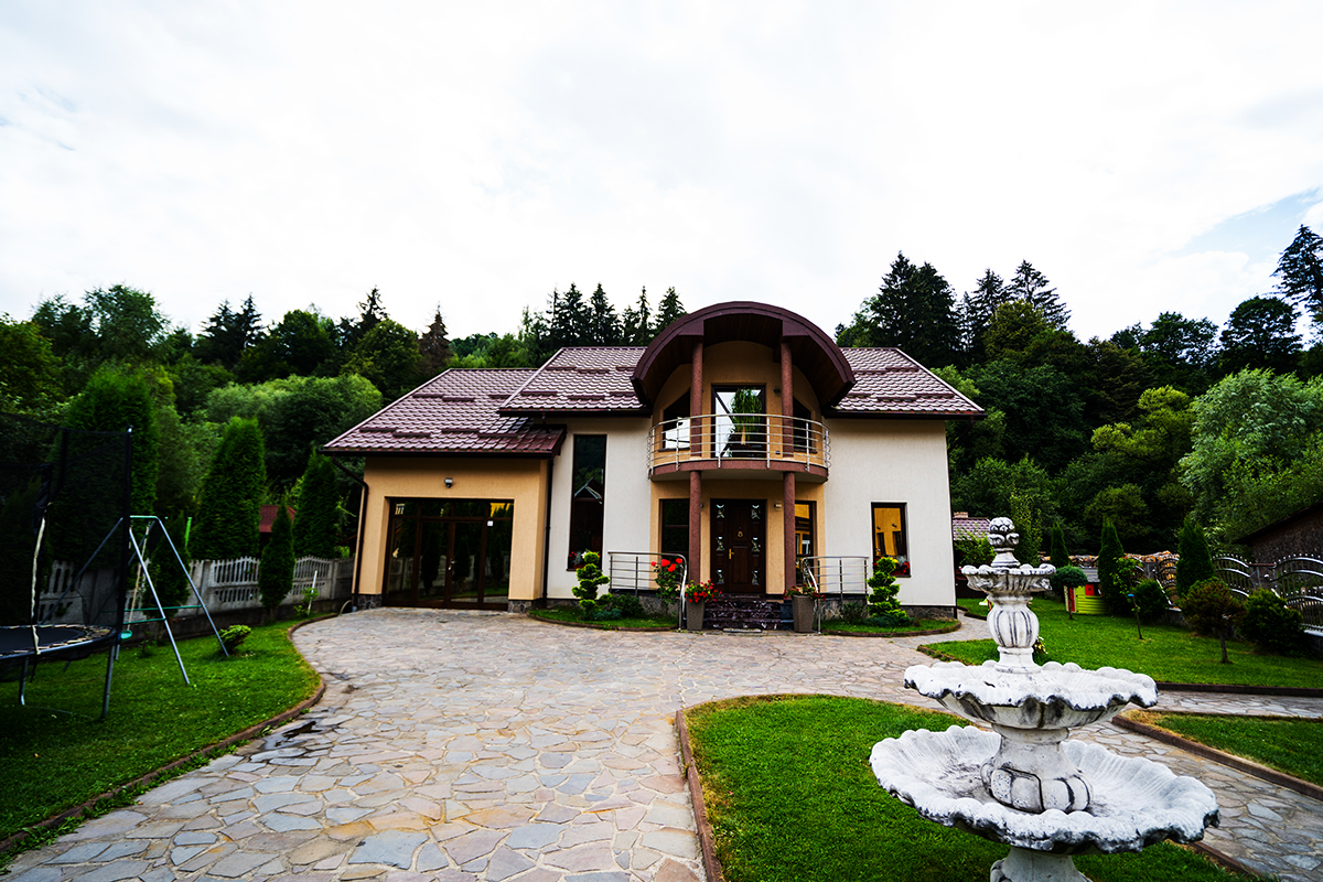 O curte spațioasă flancată de băncuțe, aleile pietruite, o fântână arteziană impunătoare și un peisaj feeric oferit de Munții Rodnei te întâmpină aici, la Perla Nordului.