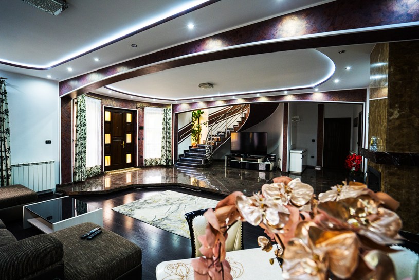Intrarea în pensiune este impunătoare ca și clădirea, iar livingul în care intri rivalizează cu aula recepțiilor din hotelurile de lux. O imensă deschidere și un zâmbet cald îți urează bun venit la Pensiunea Perla Nordului.