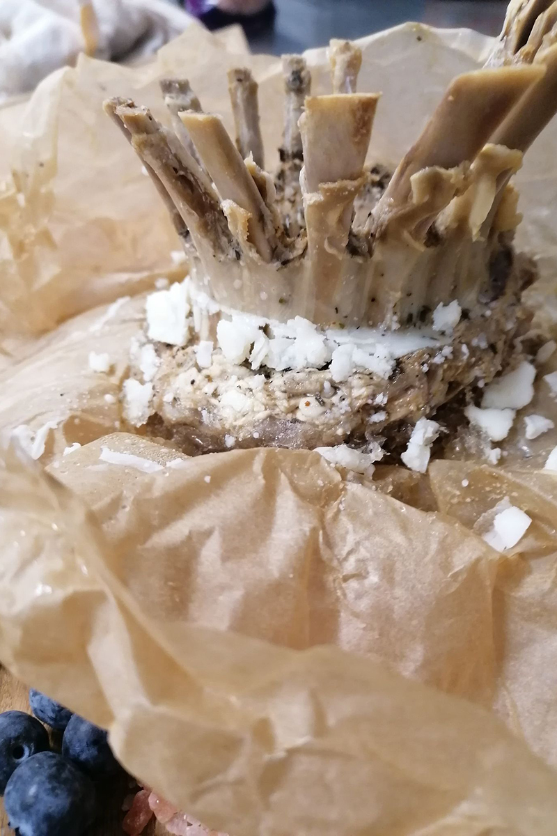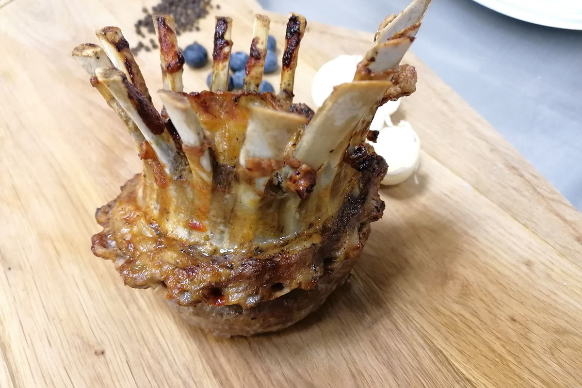 După 12 ore, chef Zsiga a scos carnea de baiț, a folosit un ac mare și a cusut coastele formând un cilindru în așa fel încât coastele să fie aranjate într-o formă ce sugerează o coroană regală.