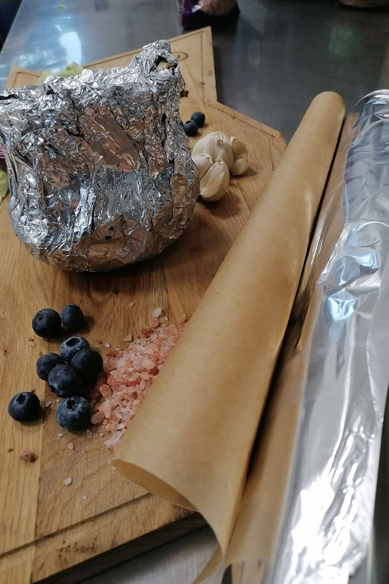 Tot acest ansamblu l-a îmbrăcat în hârtie de copt și apoi în folie de aluminiu. Totul a ajuns la cuptor, la foc mic, aproximativ 120 de grade, timp de 4 ore. Am profitat de aceste patru ore pentru a savura o cafea excelentă și a ne bucura de peisajul de la înălțime stând la o poveste.