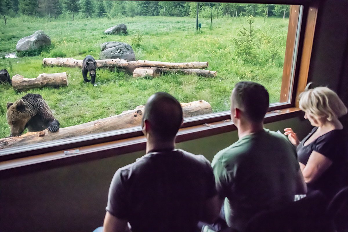 O clădire la nivelul solului, construită din beton armat de 30 de centimetri gorsime cu geamuri antiglonț, asigurate cu cornier metalic, foarte mari pentru o prriveliște mai clară asupra mamiferelor, aer condiționat, frigider cu diverse băuturi și acces la internet este ideală pentru cei care vor să privească ursul “în față”.