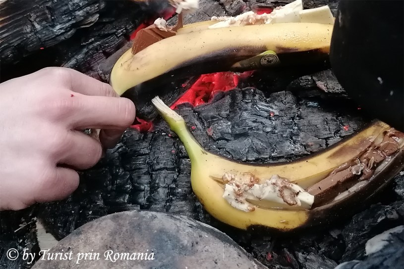 Așa se face că, după o tură în pădure am servit și ceva cârnați pe piatră cu roșii și brânză și am savurat un ceai de mentă canadiană asezonat perfect cu fumul dulce al lemnului de brad.