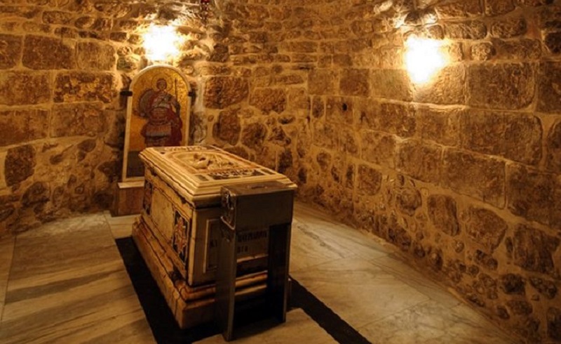 Într-o capelă subterană, actuala biserică ortodoxă păstreaza mormântul Sfântului Mare Mucenic Gheorghe și o parte din moaștele sale. În partea dreaptă a altarului, în dreptul scărilor ce coboară în capela subterană, se află „lanțurile” cu care a fost legat Sfântul Gheorghe, înainte de a fi omorât. Sarcofagul de piatră din capela a fost restaurat în anul 1871, în vremea Patriarhului Chiril.
