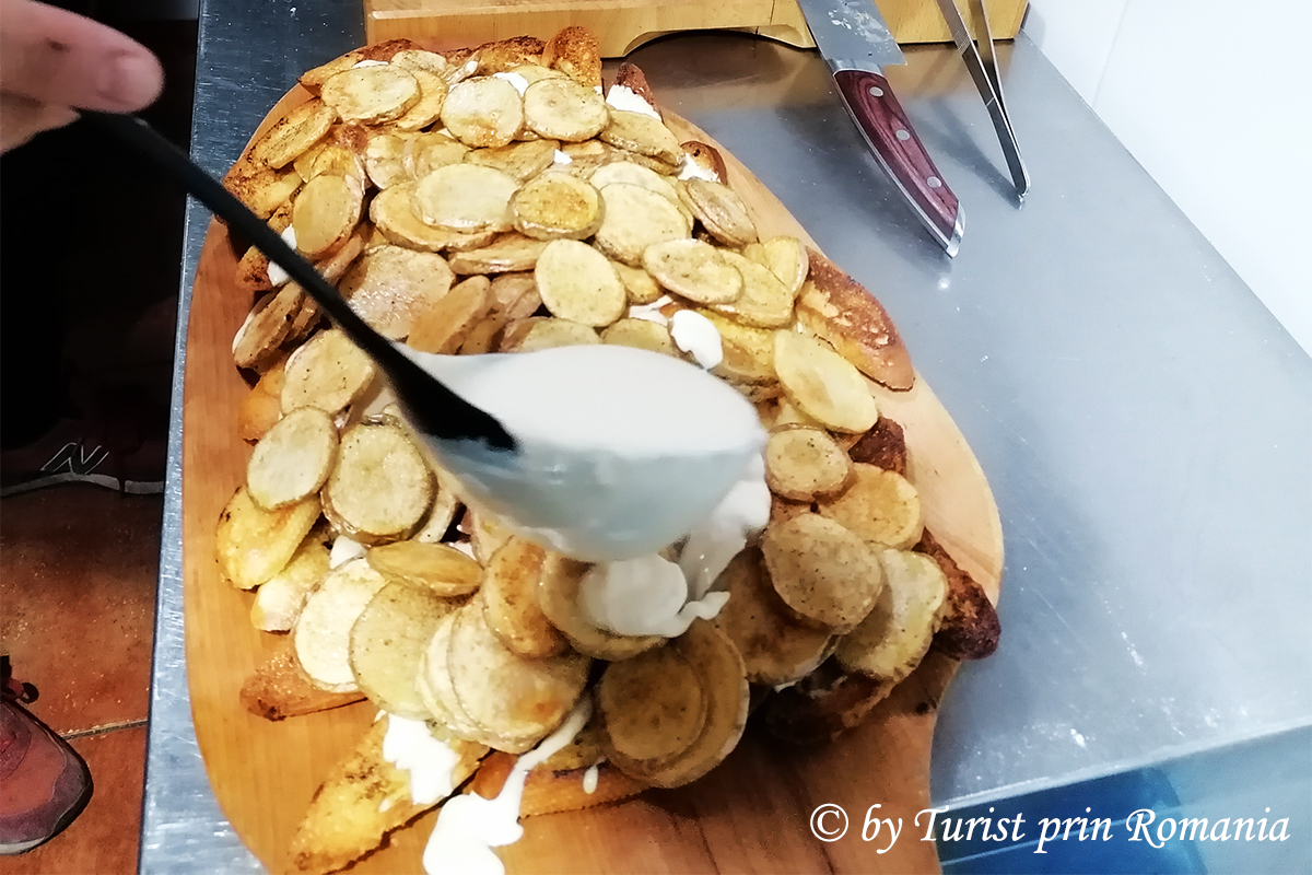 Se așează pe un platou mare pâinea coaptă într-un strat, apoi se pun cartofii prăjiți tăiați rondele, se pune un strat de mușchiuleț feliat și se toarnă deasupra un strat de sos de brânză. Se mai pune un strat de scrijele de cartofi și unul de mușchiuleț feliat, apoi se pune restul de sos de brânză și se ornează cu verdeață din belșug. Platoul este gata pentru a fi servit!