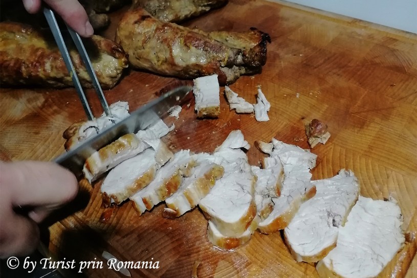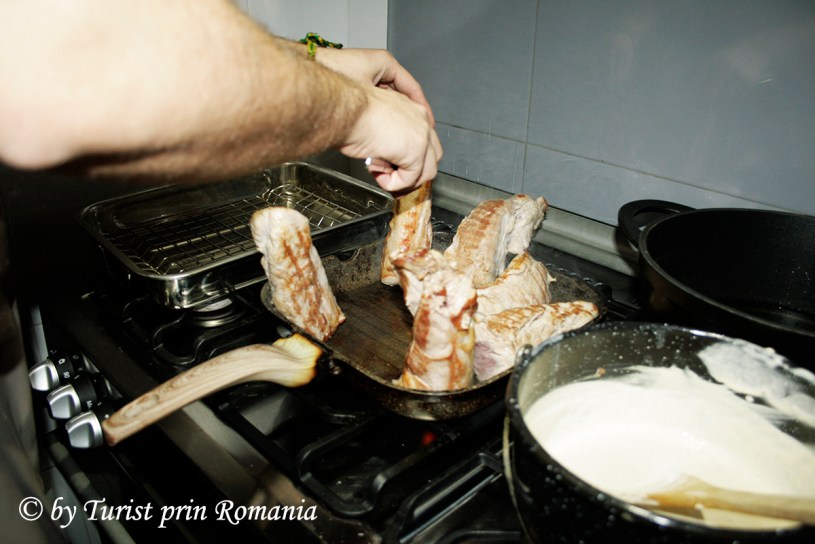 Mușchiulețul de porc apetisant, condimentele, usturoiul, salata, roșiile, untul, smântâna, cartofii tăiați felii (scrijele) și pâinea (bagheta) feliată frumos au fost ordonate în așa fel încât să fie toate la îndemână și, … procesul de fabricare a felului principal a pornit.