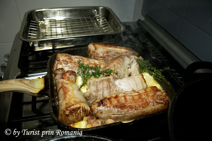 Se continuă sigilarea până când untul este topit complet, iar carnea este complet sigilată și rumenită. Mușchiuleții se așează frumos într-o tavă cu grătar și se pun la cuptor la 180 de grade, apoi trecem la partea a doua a preparatului.