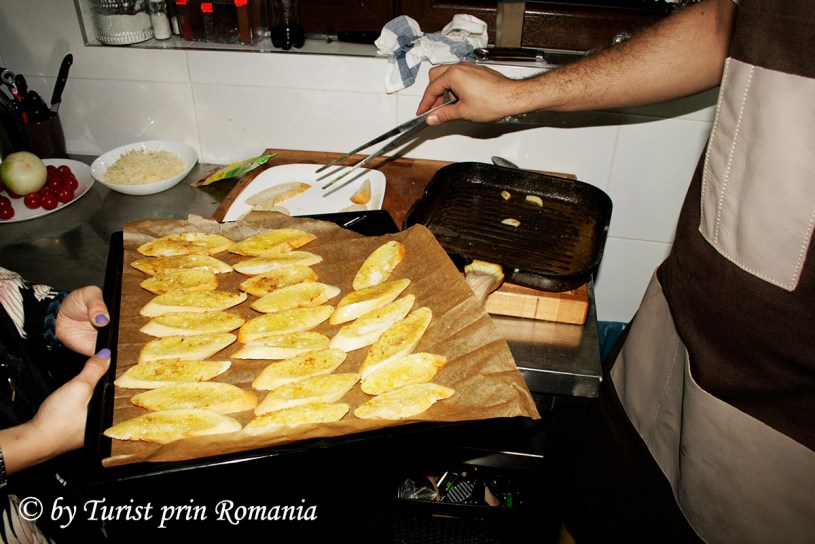 Partea a treia a preparatului constă în coacerea feliilor de baghetă. Se taie bagheta în felii subțiri, oblice, se înmoaie în sosul provenit de la sigilarea mușchiulețului, se așează frumos în tavă pe hârtie pentru copt și apoi se dă la cuptor până când se rumenește.