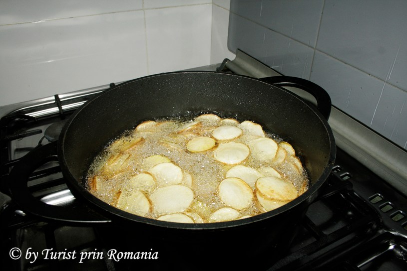 Cartofii se taie rondele, se spală bine, apoi se aruncă în baie de ulei și se prăjesc până capătă o culoare aurie, apetisantă.
