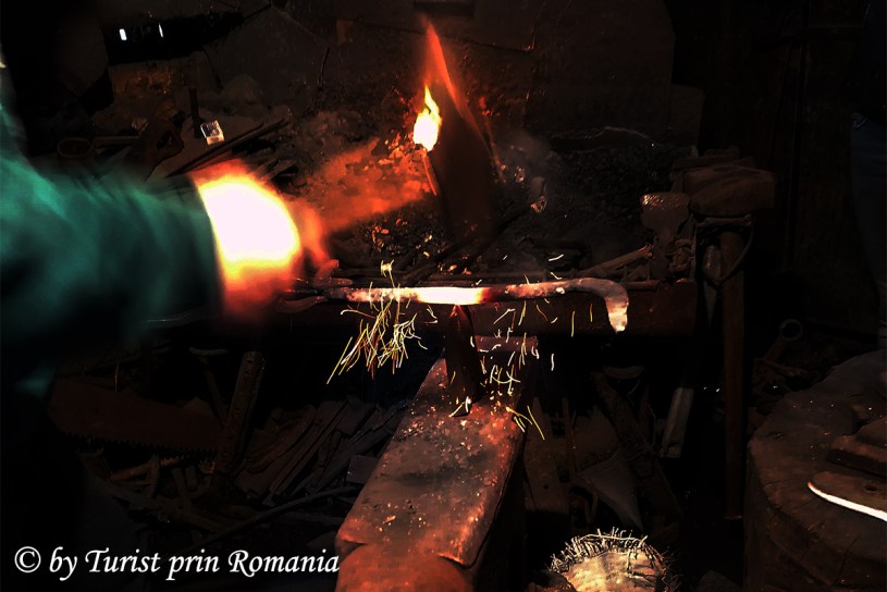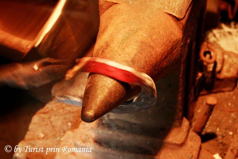 Când fierul a căpătat o culoare roșie albicioasă, Petre a apucat cu cleștele bucata de fier și a pus-o pe nicovală. În tandem cu sora acestuia, au început să lovească vârtos cu barosurile până când bara de fier a căpătat forma necesară. Imaginea pe care am văzut-o parcă era desprinsă dintr-un film cu acțiunea din evul mediu. Sclipirile agere din ochii celor doi combinate cu fierul înroșit ce sărea din materialul care se prelucra m-au transpus într-o lume în care așteptam să văd caii pregătiți pentru potcovit și călători istoviți așteptând ca fierarul să-și termine treaba pentru a putea pleca, fără zăbavă, mai departe, o imagine care a persistat până la sfârșitul demonstrației.