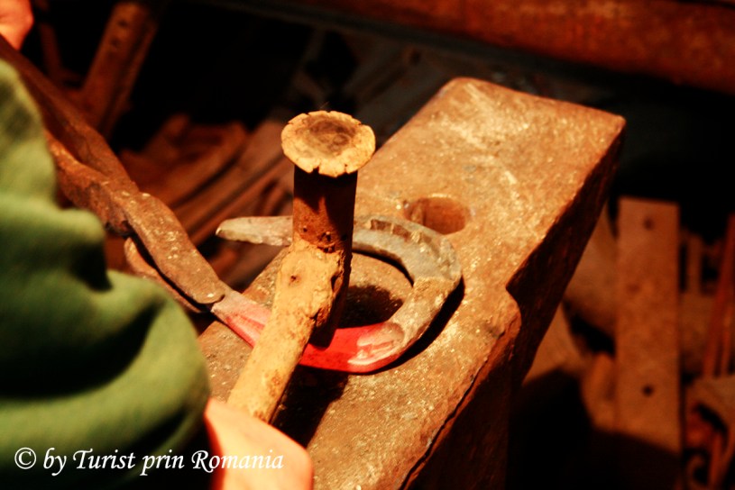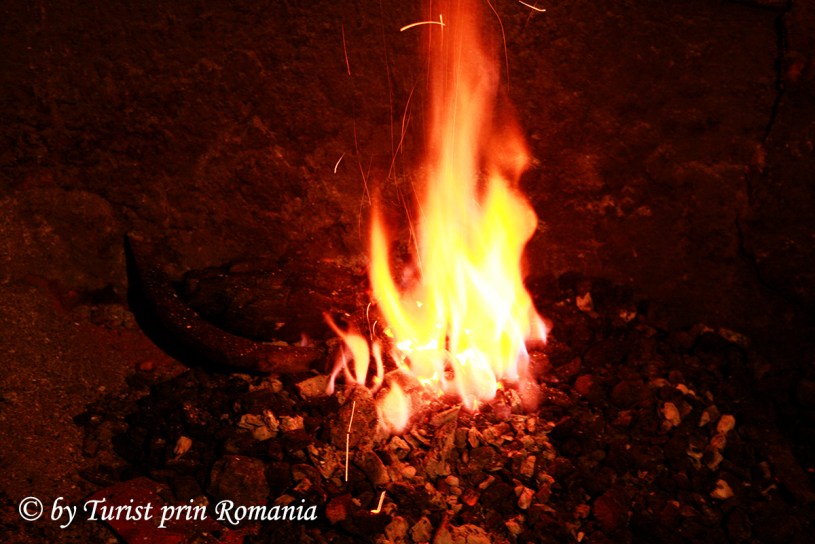 Două nicovale imense atinse de baros, ici și colo, dădeau de veste că aici avem de a face cu munca brută. Cărbunii încinși, fabricați tot de Petre, din lemn de prun sau arin ars, stins cu apă și apoi uscat, sfârâiau neîncetat sub presiunea aerului izbucnit din foalele mari acționate manual de o bucată de lemn legată cu lanț. Cu grijă și cu precizia unui electronist, Petre întorcea bara de fier în jarul cărbunilor asigurându-se că este încălzită uniform și pregătită pentru a face o potcoavă de cal.