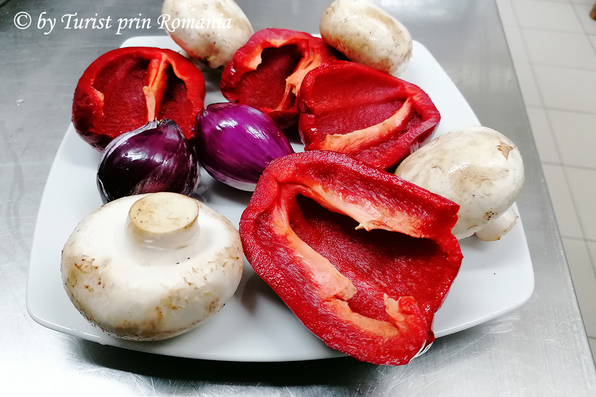Primele trase în ulei au fost ciupercile, apoi au fost adăugate ceapa roșie și ardeiul. Din când în când, pentru a asigura o călire uniformă, doamna Cristina întorcea legumele în tigaie, apoi își arunca o privire la păstrăvul pus la copt.