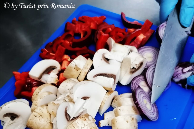Primele trase în ulei au fost ciupercile, apoi au fost adăugate ceapa roșie și ardeiul. Din când în când, pentru a asigura o călire uniformă, doamna Cristina întorcea legumele în tigaie, apoi își arunca o privire la păstrăvul pus la copt.