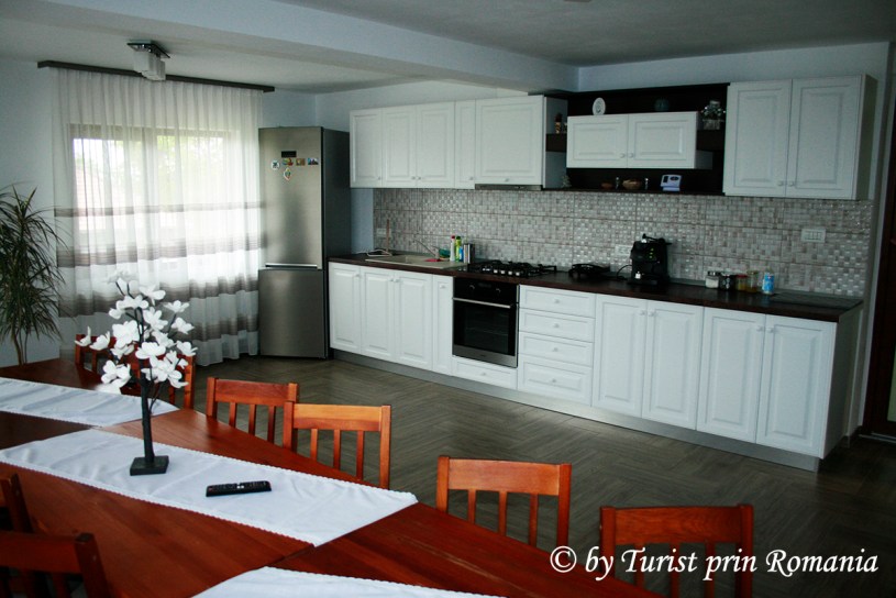 Tot în bucătărie există și un spațiu pentru servit masa, foarte generos, ideal pentru zilele mai reci sau pentru serile ploioase.