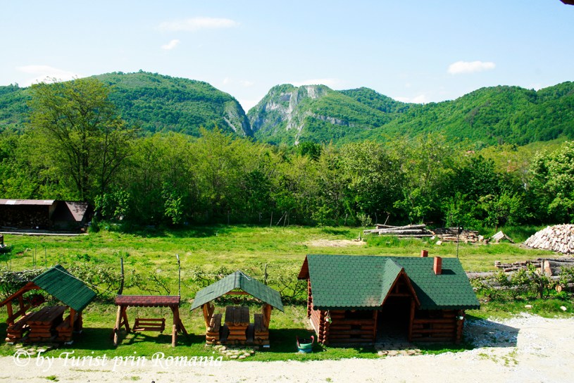 Balcoanele au vedere către Cheile Oltețului și curtea interioară a pensiunii.