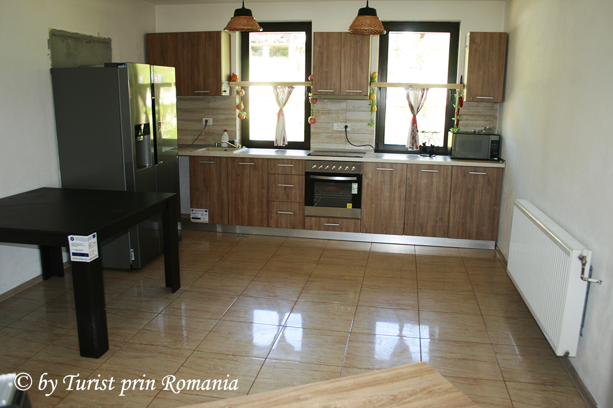 Bucătăriile open space cu salon pentru servit masa, terasă amenajată, scară interioară și camere curate, frumos amenajate și organizate care, la fiecare pas, îți aduc aminte că te afli într-un loc plin de istorie și tradiție, Oltenia de sub Munte.