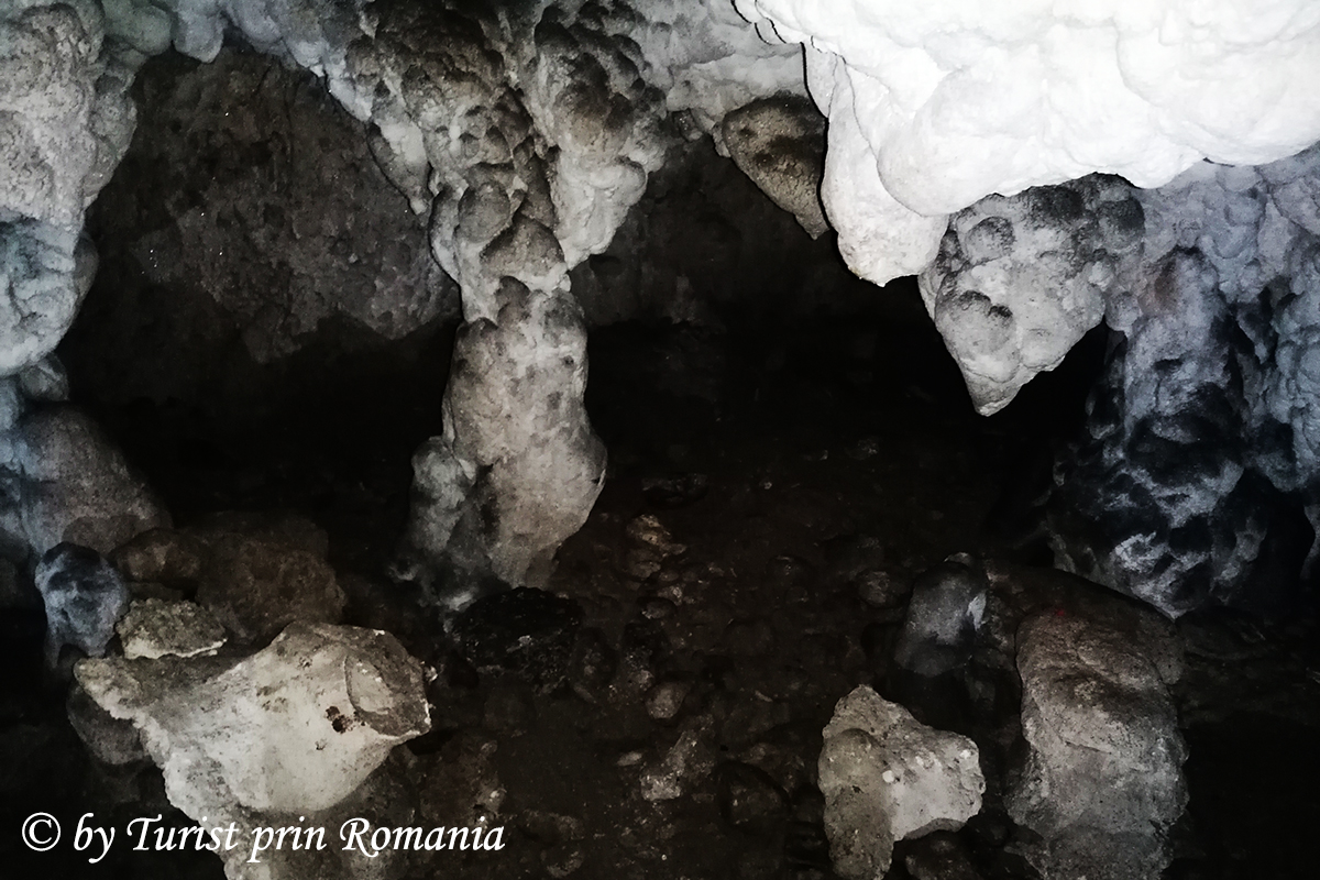 La doar 2-3 metri de la intrare, drumul se deschide și pătrundem în prima sală unde stalactitele și stalagmitele sunt încremenite în dansul de bun venit. Sclipirile calcarului te izbesc din toate părțile în lumina lanternelor, iar pe jos, un susur fin te anunță că peștera este în formare, apa fiind prezentă la datorie.