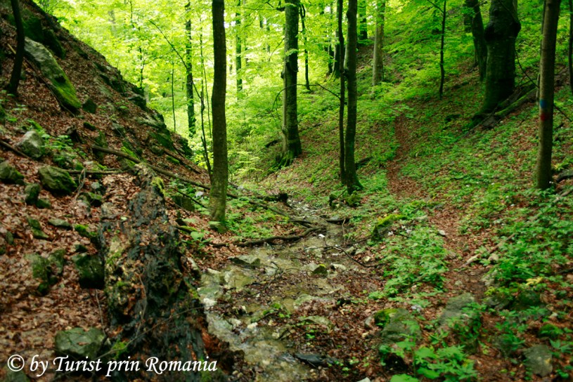 De la Oborul Jidovilor, traseul continuă pe vechiul drum de exploatare forestieră până la fosta cazarmă Bârlogul Lupilor, apoi cotește ușurel la stânga și se afundă în pădure. Peisajul se schimbă radical pe măsură ce ne afundăm în pădurea deasă de fag. Ici și colo, câte o rază de soare stingheră luminează anemic formațiunile de mușchi de la rădăcina fagilor pe care nu-i poți cuprinde cu brațele, iar tulpinile și formele acestora aruncă umbre înfricoșătoare de-a lungul potecii.