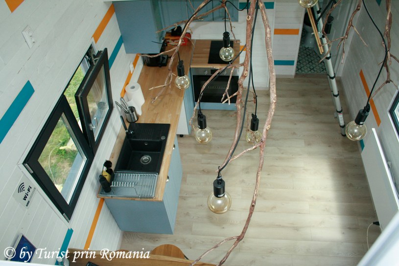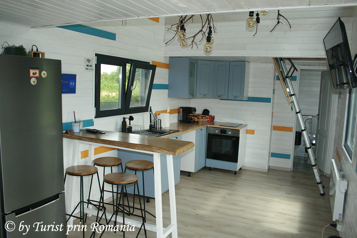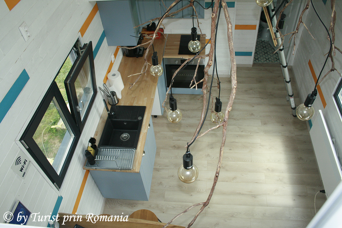Interiorul Tiny House, piesa de rezistență, este o îmbinare perfectă a modernului, bunului gust și al utilității. La parter se regăsește bucătăria complet utilată pusă la dispoziția musafirilor și o baie care deservește cele două camere de la etaj.