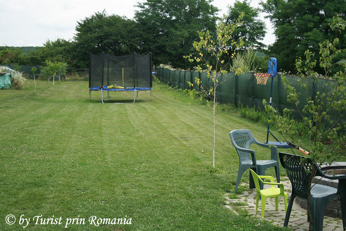 În continuare, un spațiu verde, generos, flancat cu muri și zmeură îți dă de înțeles că poți savura și din deliciile oferite de natură fără prea mari bătăi de cap și căutări. În spatele curții, o trambulină pentru copii este așezată suficient de departe cât să nu tulbure liniștea celor care doresc să stea la plajă sau la grătar.