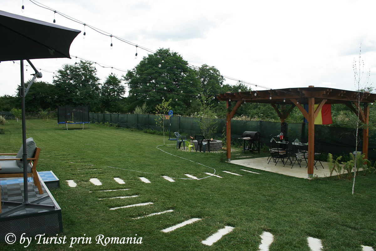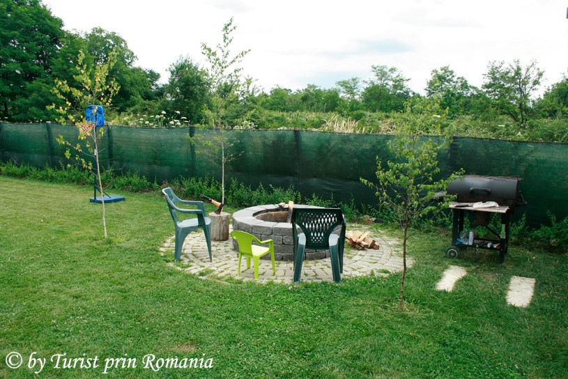 Pe partea dreaptă, un foișor acoperit, un loc special amenajat pentru grătar, pentru ceaun și foc de tabără te îndeamnă să te gândești serios la ce anume vei prepara pentru masa de seară.